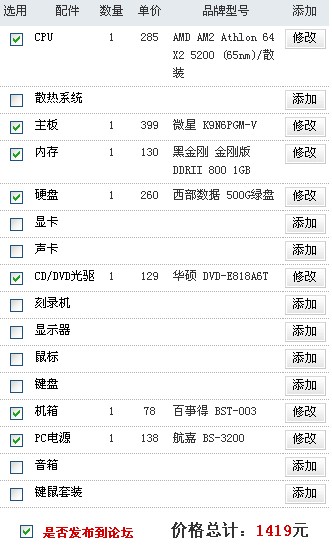 ZK浪子 研究生 注册 2010-09-22 消息 1,139 反馈评分 48 点数 71 2010-09-22 #8 不够1500, 建议你不要在水东装机,不划算, 上茂名装吧, 光驱不要可以更便宜,机箱便宜的50就有, CPU的散热器在茂名的电脑城装机时你再去买, 可买那些山寨的AM2 散热器, 或者买个青鸟09就OK了, 显示器在找个大头的就OK了,硬盘不必要拿320G的,320G和500G不差多少钱,320G都是要淘汰的了,买了不划算