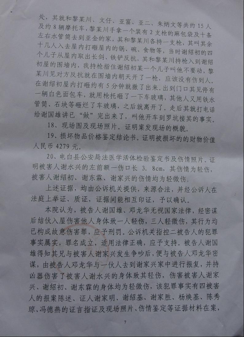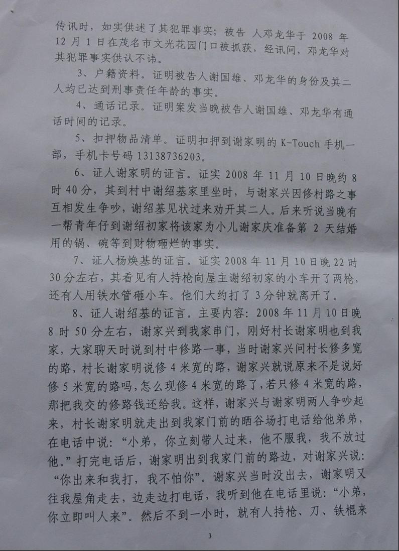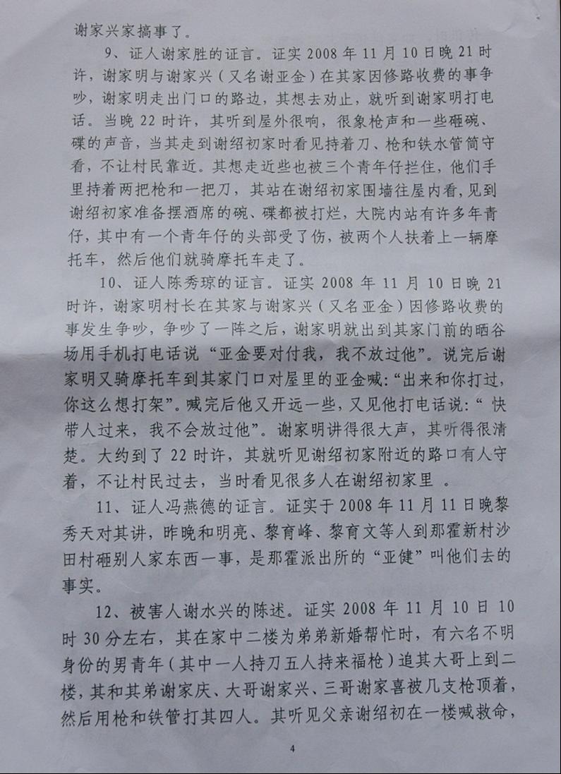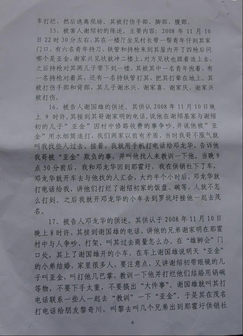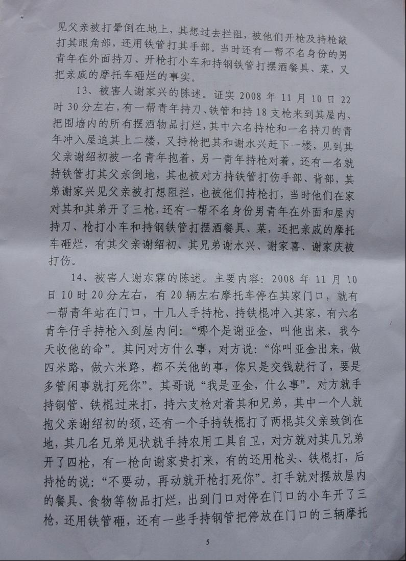当天被枪杀后受害人血流二个多钟,打成轻伤,80岁老人给打昏死中,有人不能救老人,进院未给钱,医院不下药,派出所不拍伤者照相作证据,公安不取证现场等等,让检察院、法院如何依法定“犯人”罪了……。当时,受害人给枪杀三天内,深知道他们黑势力巨大,受害人花钱、托人、找人去同黑老大“兄弟”讲和,只要求他们到受害家里赔礼道歉。只赔偿几千元算讲和了,大家都是同乡人的想法。相反,黑社会谢国雄等人不接受,还要追收受害人给“打手路费”并恶言说:“老爷谢国雄有的是钱,当地政府都是我的人,花一百几十万便能摆平你家,抓了人又马上能“无罪放人”等的恶势力相告。你有本事去告三代再说吧,都是我们干的,又咋样等等”?开审后这话“对现”了。