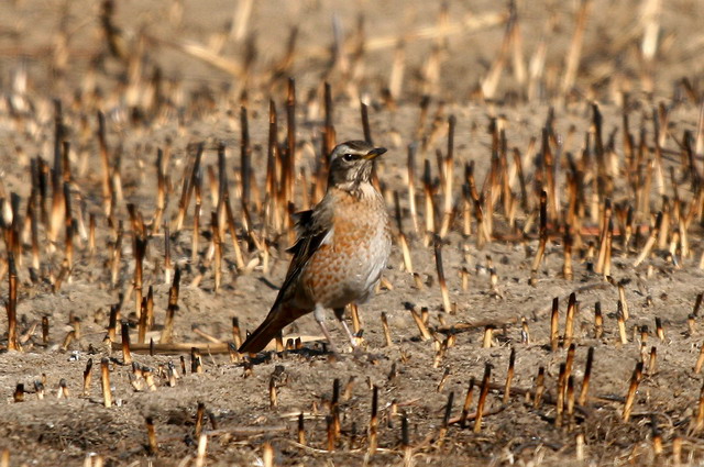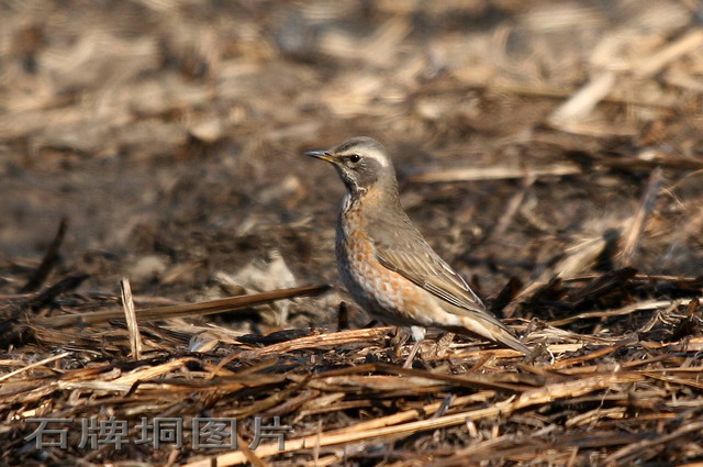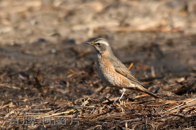 冬日,路过沙河,见河的南岸一片荒草被火烧过,隐匿中,见有两只斑鸫在过火的荒地中寻觅着过冬食物……