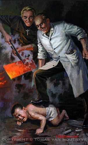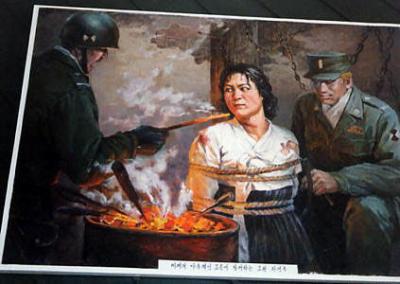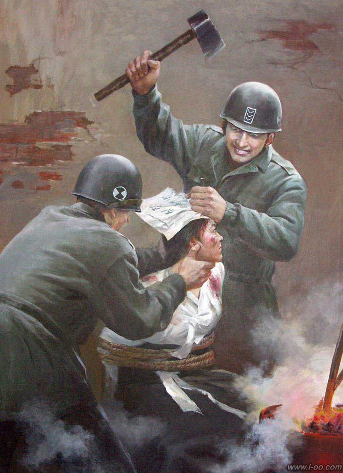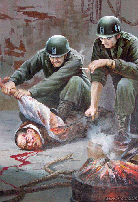 看完这些朝鲜的反美宣传画是不是觉的有点骇人听闻呢,我的感觉是“真够狠的”。没有经历过朝鲜战争也没有多少发言权。但是觉的这里面多少有点过于 “狠”了。这美帝国主义也太残忍了,活埋儿童,脑袋里钉钉子,火烧革命党人,活口拔牙....看完真让你恨的不得了啊。呵呵,我之前说的那个“狠”是这些 宣传画的力度够狠,画的彻底,想像的彻底。这就是舆论的力量。这美国人跟朝鲜民众就那么大的深仇大恨啊,要用钉子往头里钉才解恨?呵呵,朝鲜民众看完这些海报,大概心里想的都是,抓到个美国鬼子一定也要这样对他们,以牙还牙以血还血!海报上的事就成真了~ 哈哈~看书看新闻还是带 点自己的判断力去看....