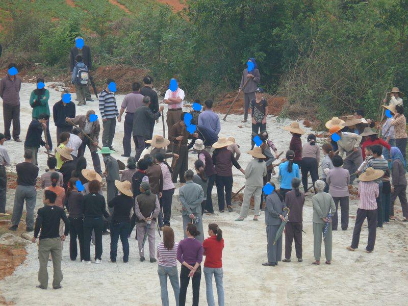 昨天(4月9日)另外多条村的村民到炮台小学运动场旁边的修路现场,阻止该村继续占用运动场修路,并且现场铲除了部分已经铺好的石粉。