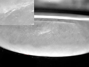 玻璃种:致密微晶结构,微晶部分不可分辨,透明度好,棉质与结构清晰分明。(图一)