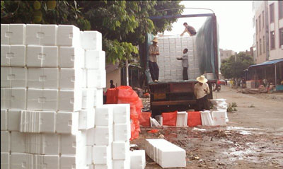 茂名是全国乃至全世界最大的荔枝种植基地,截至2009年底,全市荔枝种植面积达143万亩,其中电白县有34万亩,霞洞镇为6万多亩,有“天下荔枝第一镇”的美称。由于当地的荔枝绝大部分外销,所以运输荔枝所需的包装物品费用是笔大数目。有当地果农给南方农村报记者算了一笔账,“正常年份,霞洞大概产荔枝2万多吨,按容量20斤的泡沫箱计算,需要两三百万个。一个泡沫箱成本1元,售价5元,两三百万个就能赚1000万元左右;再加上冰块、树叶和箩筐等,总利润相当可观。”
