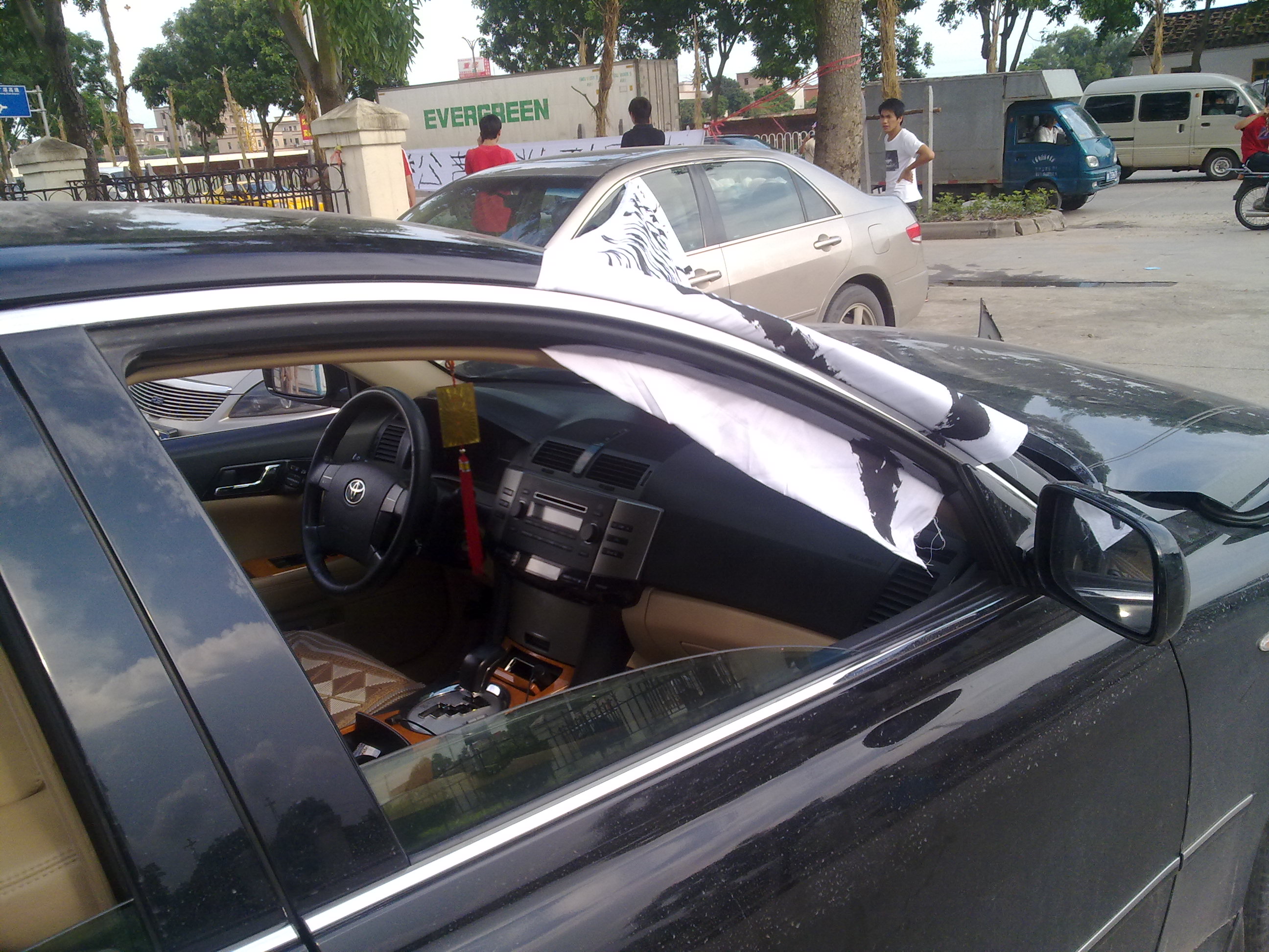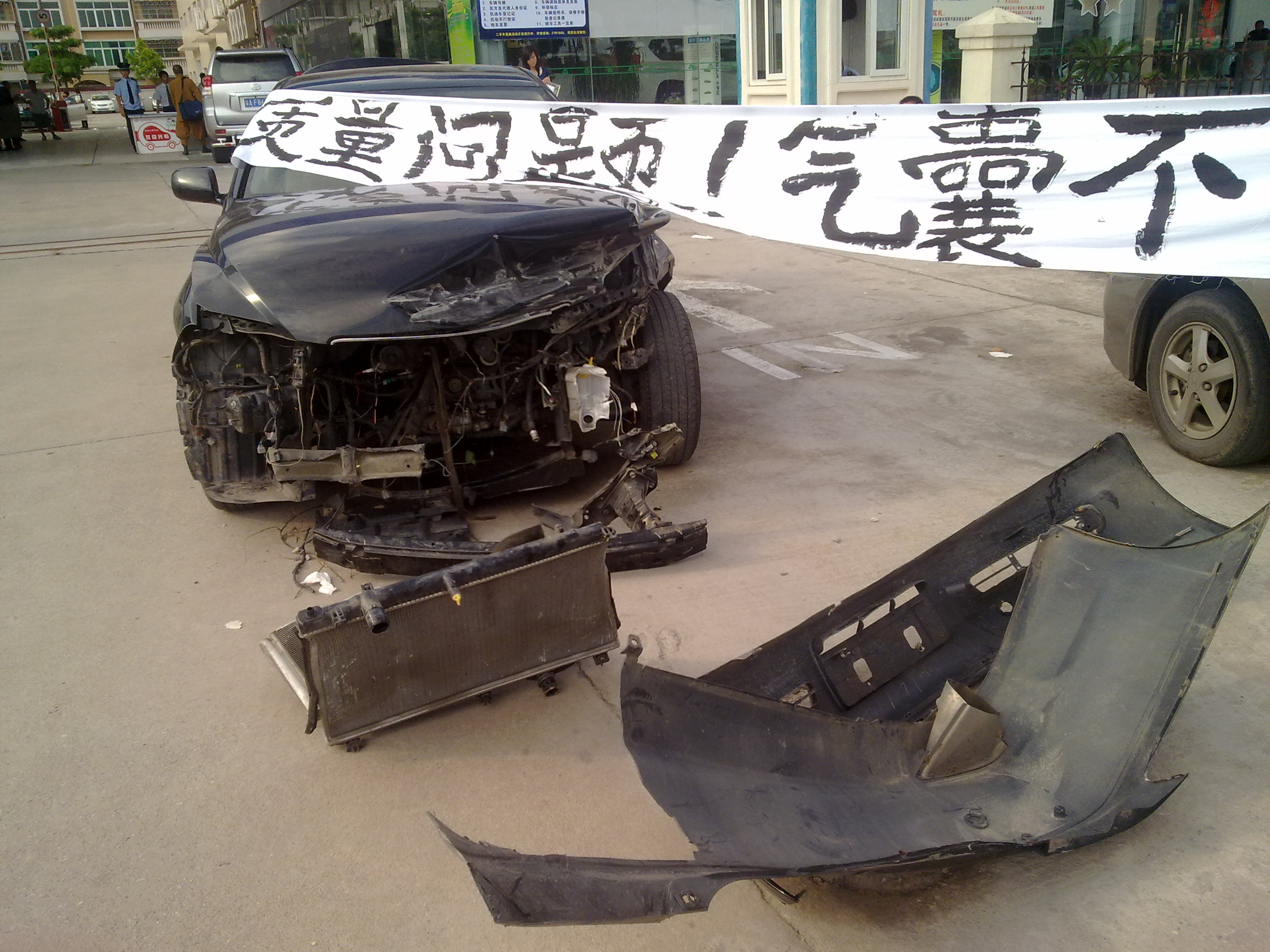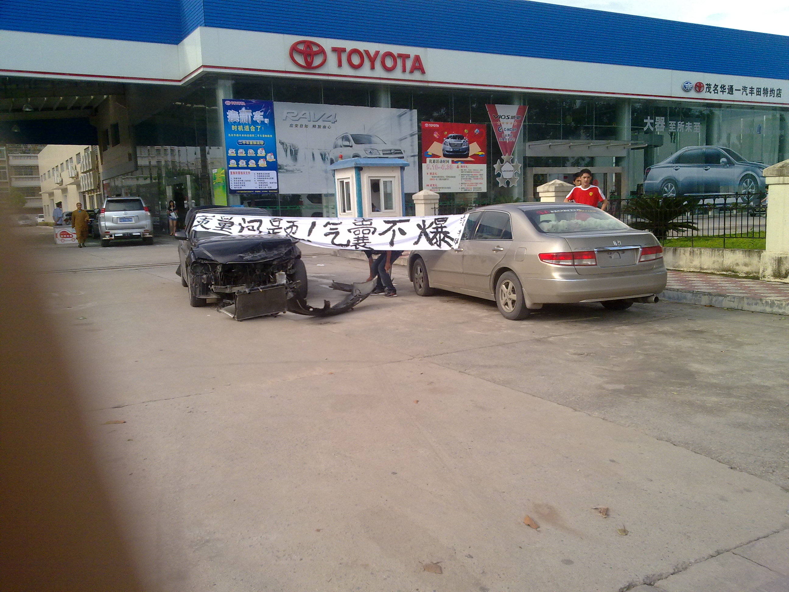 六月十一号车主把车子拉到了茂名一气丰田的销售中心的门口,并拿白布写了一些标语挂在树上和出事的轿车上,引来了大量群众,这时茂名一汽丰田的管理人员找到了车主谈话,说来说去都是在互相推搪责任,说不是质量问题而是车辆撞击力度和速度还没达到爆气囊的要求。当然车主是接受不了这种答复的,而茂名一汽丰田的管理人员也没怎么正视问题。