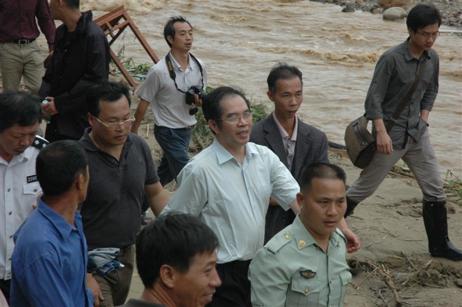 例一:昨日一大早,汪洋、黄华华和省委常委、省军区司令员辛荣国,省委常委、秘书长徐少华,副省长李容根及省直有关部门负责人翻山越岭,首先赶到钱排镇白马小学临时安置点看望受灾群众。(《超百年一遇特大暴雨袭广东55死42失踪126万人受灾》大洋新闻 时间: 2010-09-24 来源: 广州日报 )