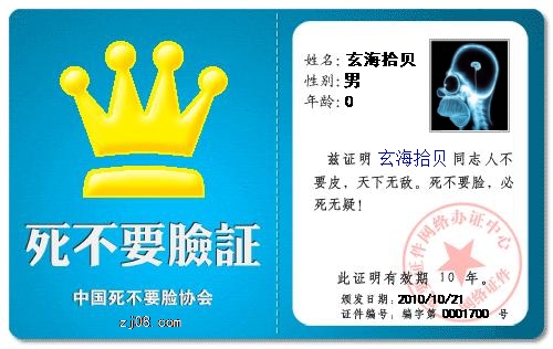 [attachmentid=247280]QUOTE(侵入者 @ 2010年10月21日 Thursday, 10:46 AM) 对付海公公,我来就可以了。继续颁奖。 [snapback]3047144[/snapback] “侵入者”又犯了个不可弥补的错误!“玄海拾贝”年龄“0”,说明此人还未存在,何来“死不要脸”?你这些“小兄弟”就这些个水平而已!你就不要再弄什么破绽出来了!一不小心,你就把“湖海山人”给卖了!“湖海山人”可是打了你们一“耳光”了--他说“玄海拾贝”是“文革”时期的,他才是现在的“硕士”,因此“同班”争“班花”的谎言不攻自破了。“人多好办事”,但人多也易坏事哟!