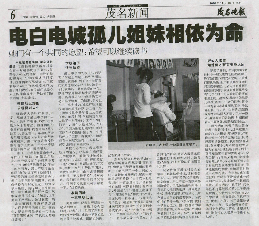 11月9日,爱心人士严梓恩先生随同茂名晚报记者郭记、梁记探望两姐妹,分别到访了严明珍所在中学、严带娣所在小学、暂住的也是工作的所在发廊、破旧的房子旁的邻居等了解到两姐妹的处境,严生被她们身处困境中但却能不断自勉的坚强生存的信念深为感动,对两姐妹作了鼓励并现场捐助了两姐妹200元,对于她们往后生活并表示关注和支持。