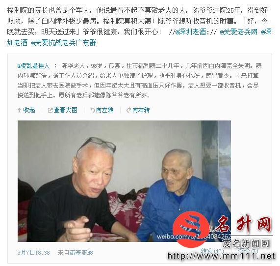 从 @行者孙冕 新浪微博上得知,当 @关爱老兵网 发出寻找抗战老兵的呼吁,广东信宜义工团的义工从当地民政部门找到这份名单,又经公安户籍网核实,开始逐一探访,被遗忘半个多世纪的抗战老兵始见天日,世人对他们的关爱才能实现。回看老兵给志愿者们行上军礼,真感动!
