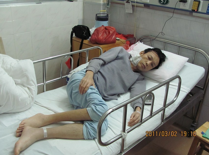 去到医院的时候,我便看到照片上的那一幕!这个曾经健壮的男人,如今却被病魔折磨得骨瘦如柴。邵老师昨天刚做完透析,今天的情况好些,我传达了很多网友的好意,还告诉他有个沙琅的好心人很关注他的事情,他说想知道好心人的名字,我就告诉他哪位好心人叫黎苡铭,他用手机记录了下来说要谢谢他!