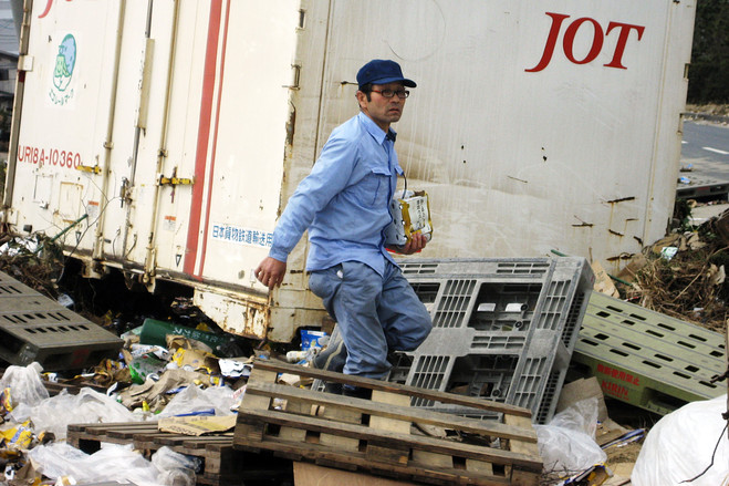 地震引发的海啸袭击了麒麟啤酒公司(Kirin Brewery)位于日本仙台市滨海地区的工厂,造成数个巨型啤酒发酵罐倒塌、大量啤酒瓶、酒桶和其他货物四散港口。目击者说,潮水退去时,数百人运走了从麒麟啤酒厂仓库散落出来的啤酒、咖啡、果汁和其他产品。图为一名不明身份的男子抱着在麒麟啤酒厂附近找到的一箱啤酒离开,他不愿与记者交谈。