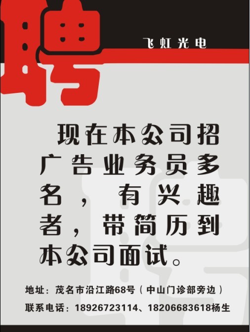 Y ygp841130 学前班 注册 2010-05-13 消息 32 反馈评分 0 点数 0 2011-06-08 #1 公司现在招聘广告制作男学徒,待遇:1000元/月,上班时间:8:00-12:00、14:00-18:00。一个月休息两天,不包吃住。联系电话:18926723117/15917115014 陈小姐 附件 未命名1.jpg 60.4 KB · 查看: 296 未命名.jpg 134 KB · 查看: 312
