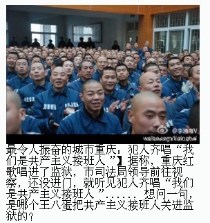 据说红歌已唱到监狱,一群囚犯正满怀激情地唱着:“我们是共产主义的接班人````````”