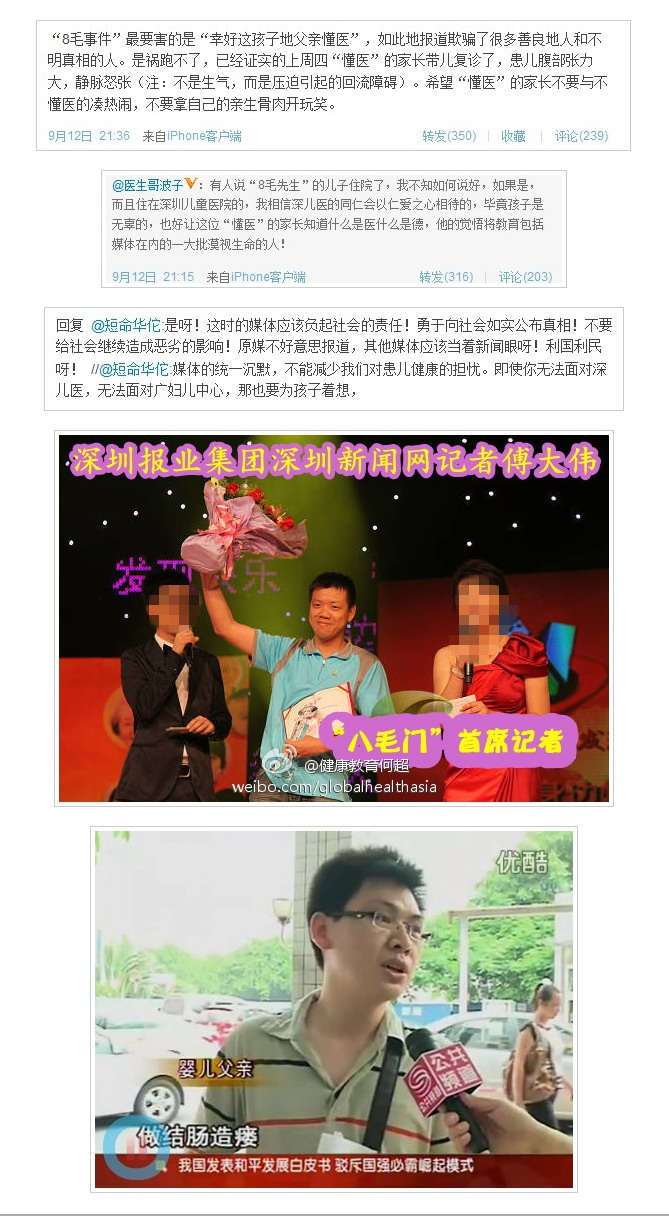 大白菜 小学一年级 注册 2011-08-24 消息 147 反馈评分 0 点数 0 2011-09-14 #31 医德?是给患病小孩开出8毛钱药敷衍了事的医生缺德还是不顾孩子生死网上博 风头的那个陈先生缺德?? 8毛钱“治愈”儿童病情反复 中秋节广州洗肠 2011年09月14日 来源:大洋网-信息时报 作者:袁建彰 《10万元手术8毛钱搞定?》追踪 □本版撰文信息时报记者袁建彰 昨日,有网友称“8毛钱”事件中的患儿小志病情危重,已在广州市妇女儿童医疗中心住院治疗。记者从医院了解到,小志确实来过医院治疗,就诊时腹胀严重,还影响到呼吸不畅。经过灌肠后孩子情况好转,家长坚决要求出院。 记者随后联系上小志的父亲陈先生,他承认儿子确因病情反复而入院接受治疗,不过表示“孩子目前状况良好”。 医院:复诊时小志腹胀严重 医生要求住院观察,但患儿父亲坚持出院 昨日上午11时许,一位自称是深圳市儿童医院小儿外科医生的网友“深圳胖胖熊”发微博称:“8毛钱”事件中的患儿小志病情危重,昨日已经在广州市妇女儿童医疗中心住院接受治疗。 “现在可以非常负责地告诉大家,‘八毛门’的孩子昨日已经在广州儿童医院住院,孩子病情危重。”网友“深圳胖胖熊”昨日上午11时44分发出的这条微博迅速被网友热转,随后在12时43分,他又发了一条微博,进一步描述了小志的住院细节:“患儿现住在广州儿童医院新生儿外科54床,是一个曾经在深圳儿童医院外科和小志同住一个病房的患者家长在广州儿童医院看到的,消息可靠。” 根据这名网友的报料,记者在昨日下午3时许赶到广州市妇女儿童医疗中心小儿外科,但并未找到小志和他的家属。54床的牌子上也没有任何患者的信息。一名护士告诉记者,该床患者已经在中午1时前出了院。 妇儿中心小儿外科的接诊医生告诉记者,中秋节的早上,陈先生确实带了小志来到小儿外科就诊。他回忆,当时小孩肚子胀得厉害,鼓鼓的,连腹膜经脉都凸现出来了,“当时孩子表现的症状确实比较严重,而且还影响到呼吸不畅。”这位医生告诉记者。 不过,由于尚未确诊为先天性巨结肠,这位接诊医生称,还是对小志采取保守治疗的措施,让他接受灌肠处理。而由于孩子的腹胀问题为洗肠带来一定难度,他当时就告知过家长,灌肠过程有可能出现穿孔风险,家长最后还是表示同意洗肠。接诊医生说:“灌肠还算顺利。灌完肠后,孩子的腹胀症状有所好转,家长随即要求出院,态度强硬。但考虑到孩子有点发烧,因此医生没有同意让他出院,要求其留院观察,然而,家长出院的愿望依旧强烈,还签署了《出院同意书》。尽管如此,我依然让他多住一个晚上。”接诊医生说。 父亲:只是常规复查情况良好 陈先生称如果确诊是巨结肠会接受手术 昨日,记者来到陈先生在深圳市龙岗布吉的住所,但是无人应门。记者又到陈先生所就职的附近的某民营门诊部,该门诊部的工作人员称陈先生已请假,未来上班。 随后,记者电话联系上小志的父亲陈先生,他表示,中秋节早上确实有把小志带到广州市妇女儿童医疗中心,不过只是做常规的复查,昨日上午,他已经为儿子办好出院并于当天回到深圳。 陈先生告诉记者,前日早晨,他带着小志到广州市妇儿中心挂了专家号,该院接诊医生为宝宝看诊后建议继续按此前李成昌教授的意见处理,并于当日住院观察,“医院采取的是保守治疗方法,继续使用石蜡油进行灌肠。”陈先生称孩子住了一天院,自己在此间也向护士学习了解了一些新的灌肠方法等护理知识。他还透露,医生建议过三个月后再来进行诊断是否为先天性巨结肠。 谈到小志目前的情况,陈先生说,孩子目前状况良好,“之前孩子肚子还有点鼓,但是现在非常平坦,与正常孩子没有什么区别。”陈先生表示,如果孩子真的是患先天性巨结肠,也会做手术,但目前仍要质疑深圳儿童医院,为何8月24日就要求签字造瘘手术,“孩子这么小,做肛瘘手术很危险,而且会很痛苦。”陈先生坚持说。 而对于无人应门一事,陈先生在电话中也告诉记者说,孩子的奶奶不同意宝宝见外人,说必须要等到满月以后才行,而这件事情曝光后影响到自己的生活,最近也很累,所以不愿意再接受媒体的采访。 廖新波:小志患的就是巨结肠 他认为广州妇儿中心说未确诊是为缓解医患关系 广东省卫生厅副厅长廖新波连日来也一直在关注“8毛钱”事件的发展,昨日,他在接受信息时报记者专访时强调,家长陈先生要尊重事实,虽然陈先生本身是一名牙医,但其对医学其他方面的问题可能也是“一窍不通”的,希望他不要再意气用事,否则可能会害了自己的亲生骨肉。同时,廖新波还在微博上呼吁新生儿家长们不要拿自己孩子的生命来开玩笑。 廖新波认为,目前不管是深圳市儿童医院还是广州妇儿中心,对于小志患有先天性巨结肠的诊断其实已经可以确定成立,而巨结肠的最佳处理办法就是手术治疗。至于医院方面给出“未最终确诊”的说法,廖新波认为这只是医院因为当前医患关系紧张而给出的一个很保守的说法,“其实谁看见这个钡灌肠的X光片,都明白是巨结肠无疑了。”廖新波说。 廖新波还爆料称,深圳妇儿医院一名新生儿因患有不全性肠梗阻而导致腹胀,医生会诊后建议其进行结肠造瘘手术,但其家属看了媒体关于“8毛钱”的报道,一口拒绝手术建议后带孩子回家,次日晚急诊入院,肠道已经穿孔需要进行急诊手术。他说:“肠穿孔