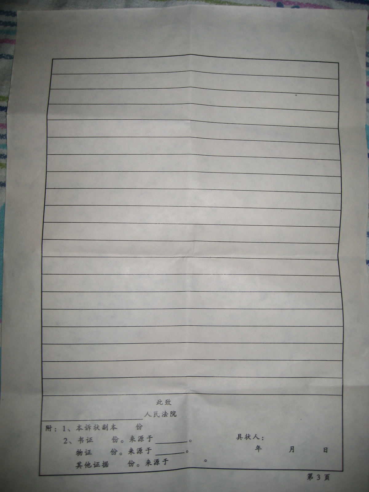 接着,我上了三楼,进了电白法院的办公室,凭感觉走向一个看起来有点像负责人的同志,开口问他:“给我一份行政状纸!”