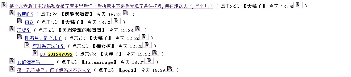 此事件真假真的难以辨别,但楼主QQ今天出现过在“鼎盛论坛”里面,主帖已被删除,只能查也一样是讨论孩子送人的事情。