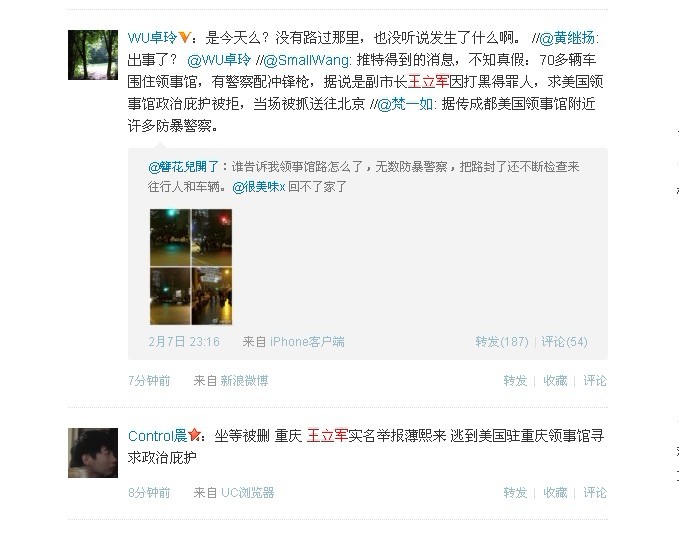 从2月7日晚间开始,国内微博开始出现美国驻成都领事馆周边路段出现大批军警戒严的消息,并上传了大量现场图片,有行人被阻通行并禁止询问原因,同时有目击者见到一辆渝A字头的越野车停在领事馆外,随后被警方拖车拖走。魏如久律师最先发出消息:“重庆市副市长王立军逃至美国驻成都领事馆要求避难,被拒绝后已被公安人员拘捕送至北京。” 此消息随后在国内网络被迅速大量转发