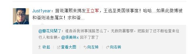 //@SmallWang: 推特得到的消息,不知真假:70多辆车围住领事馆,有警察配冲锋枪,据说是副市长王立军因打黑得罪人,求美国领事馆政治庇护
