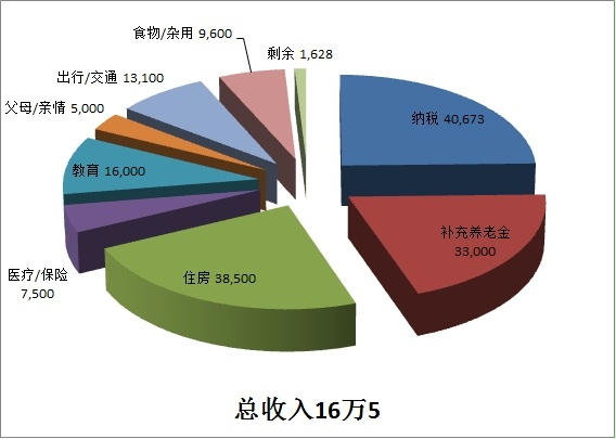 纳税主要是三部分:联邦收入税,州收入税和社会保险/医疗税,有的地方象纽约市还有纽约市税。象房产税和汽车持有税也是大头,但这里没有算在其中(房产税算在住房开销,汽车持有税算在出行/交通里)。总共纳税4万0673,占总收入的24%,最大的一部分。