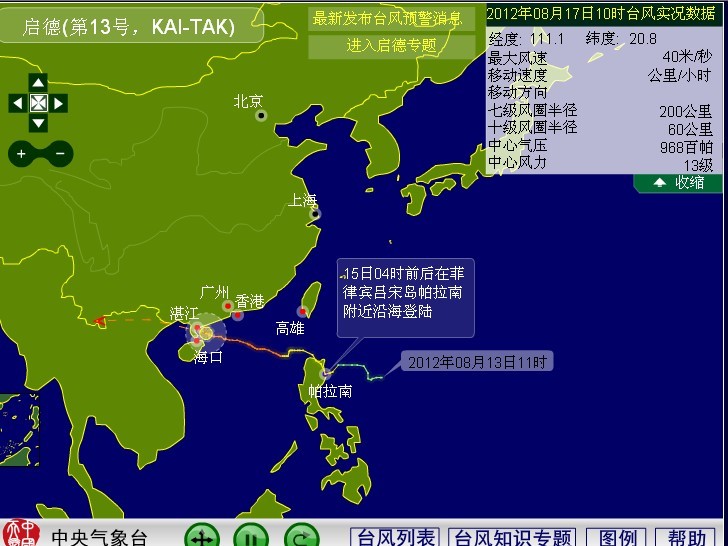广州卖手机大哥 荣誉会员 荣誉会员 注册 2006-11-01 消息 10,291 反馈评分 48 点数 71 2012-08-17 #31 最新消息:今天上午 9 时,台风 “ 启德 ” 中心位于北纬 20 点 7 度,东经 111 点 2 度, 也就是在湛江市东南方约 100 公里 的海面上 ,中心附近最大风力 12 级,达到 35 米每秒的风速,中心最低气压 970 百帕,八级大风范围半径约 220 公里。 预计, “ 启德 ” 将以每小时 25 公里左右的速度向偏西北方向移动,逐渐靠近我省西部海面, 将于 17 日中午前后在吴川到徐闻之间的沿海地区登陆。