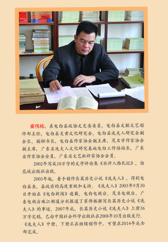 我一要好的朋友有幸被县委县政府邀请参加第二届电白县向前进主题活动暨岭南圣母文化节,带回来一本由崔伟栋主席创作的小说《冼夫人》和一本名为《爱国爱民,团结统一的光辉典范――冼夫人》的小册子。朋友向我介绍了这本小册子,说这就是崔伟栋主席在电白电视台所做的中华美德讲座的演讲稿。