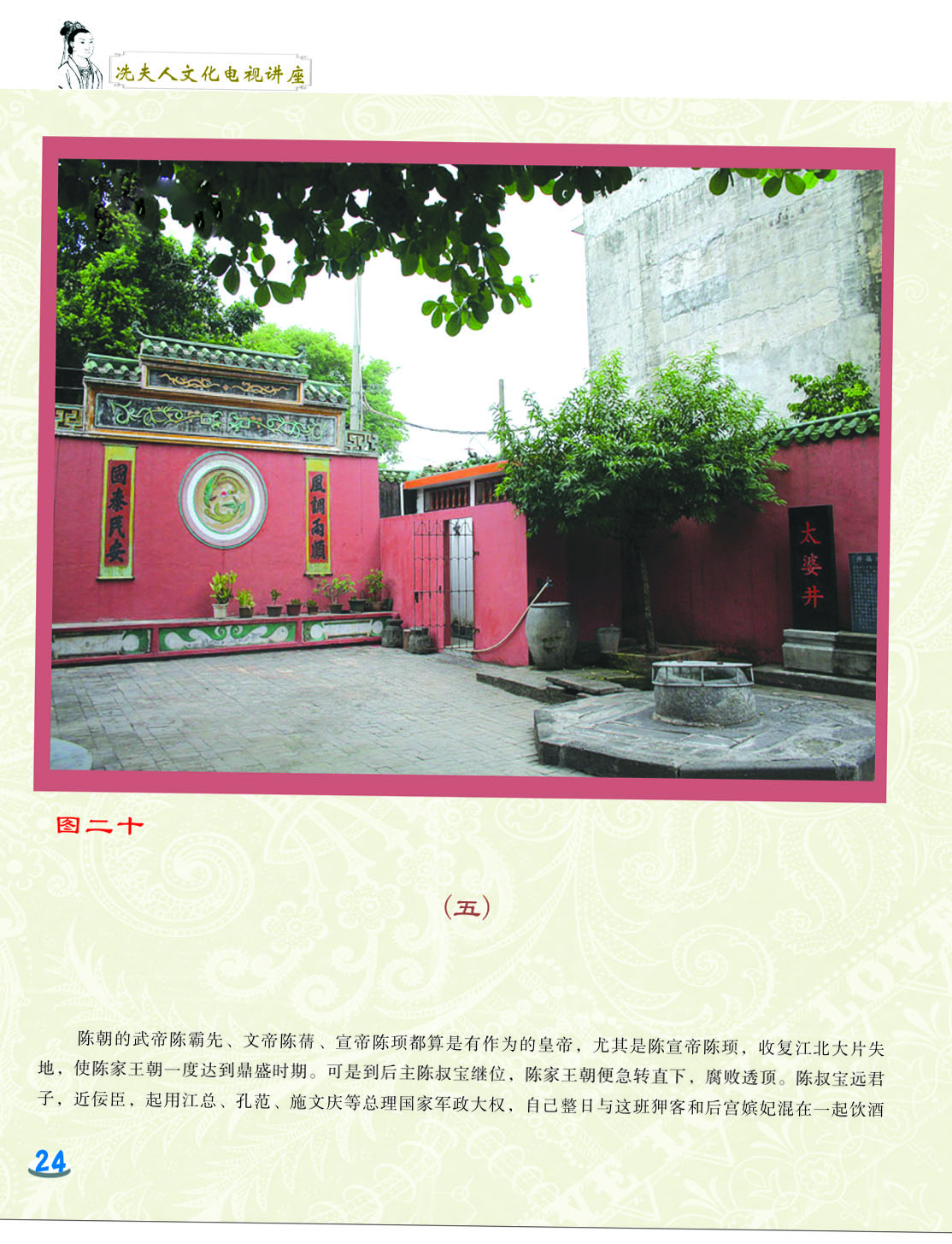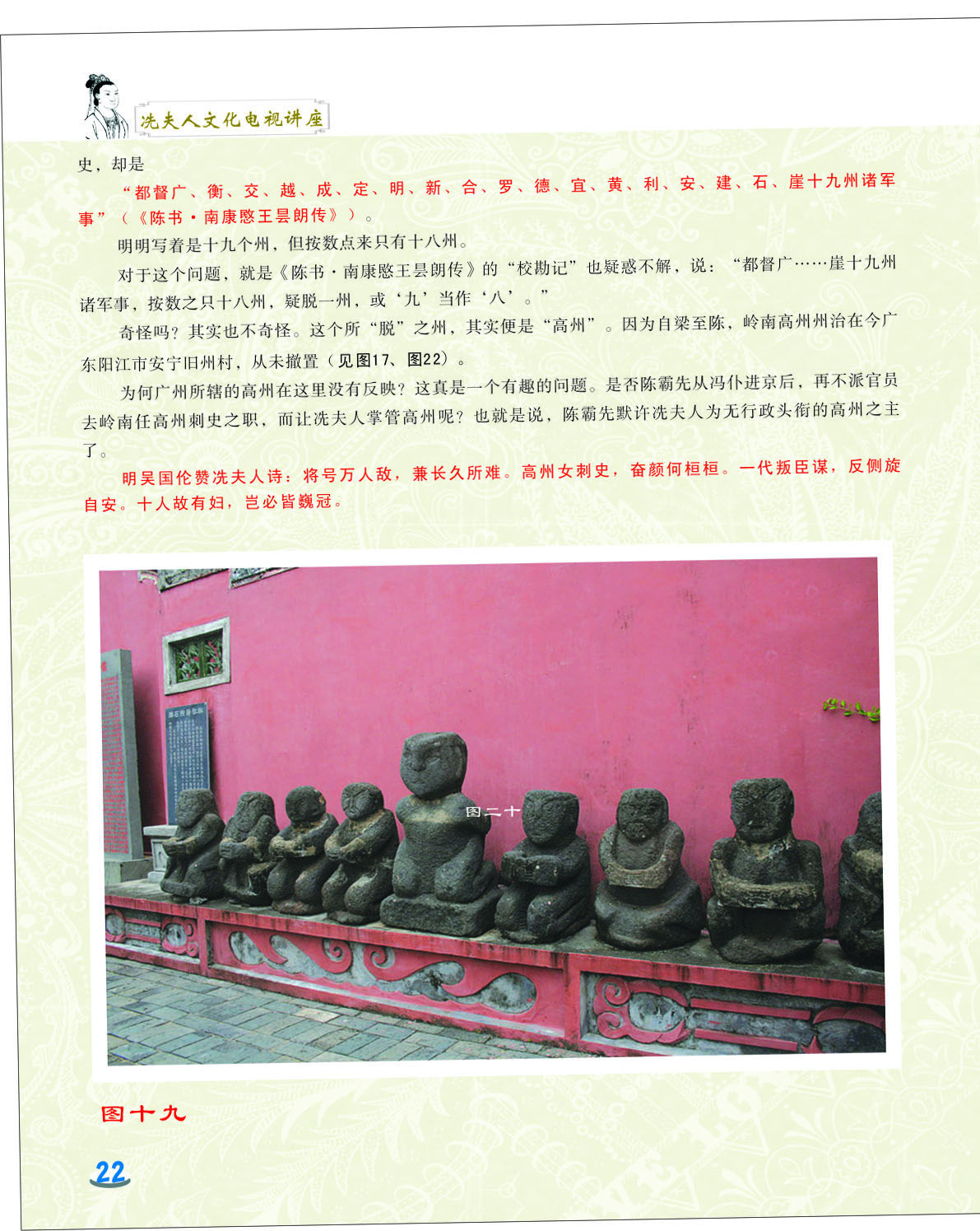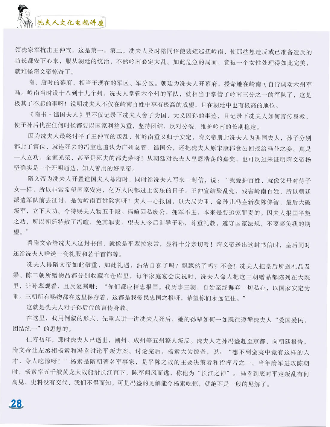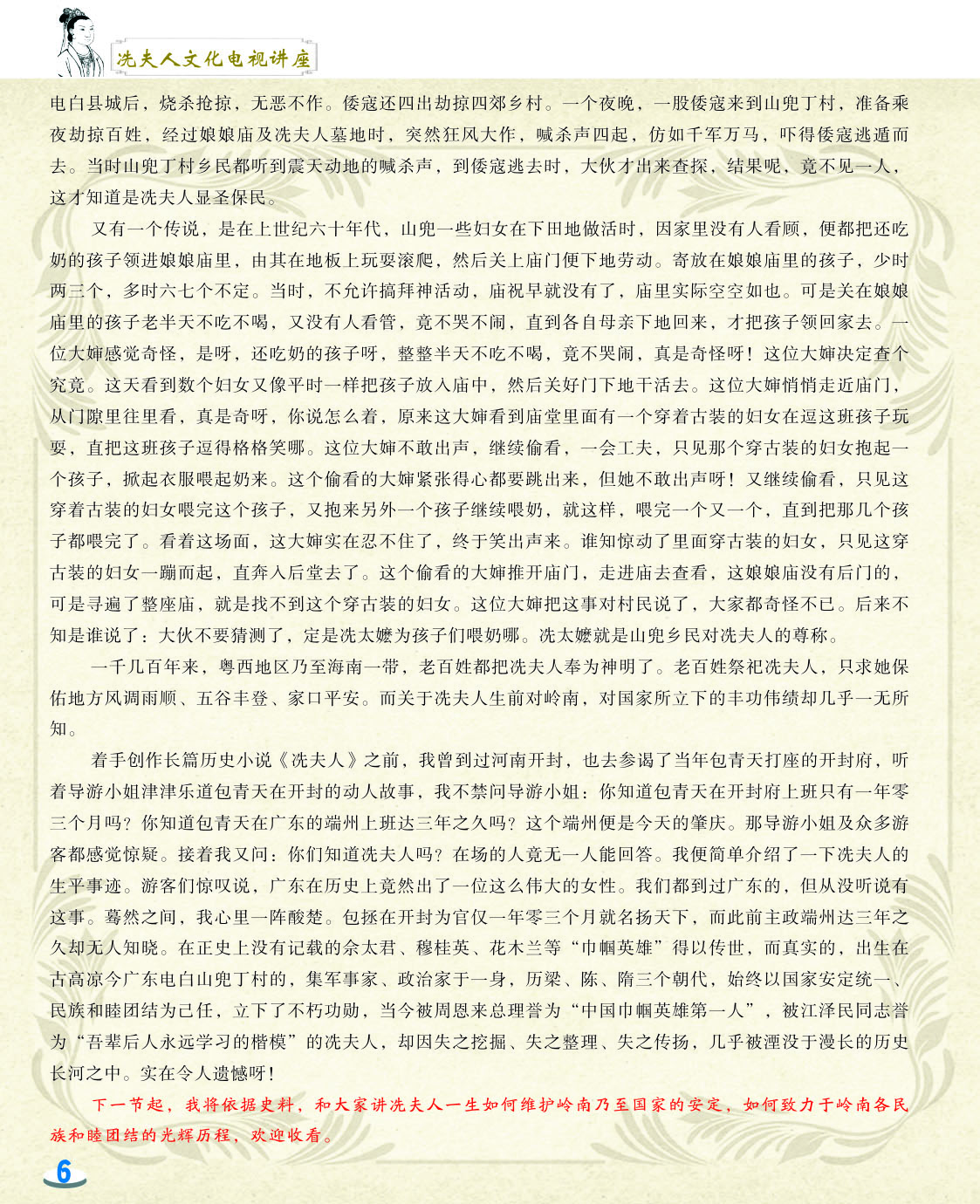 我细心地翻阅着这本小册子,第一感觉是这小册子非常精美,古色古香。第二感觉是内容图文并茂,深入浅出,用显浅的语言道出深刻的道理。内容共分六讲,第一和第二讲是关于冼太夫人的墓葬地以及故里问题,第三讲是关于冼太夫人在朱崖置州的故事,第四讲是关于冼太夫人为什么要派年仅九岁的儿子进京的问题,第五和第六讲是关于冼太夫人大义囚孙的故事以及冼太夫人的孙辈后人怎么以国家为重,坚决维护岭南乃至国家安定统一的故事。