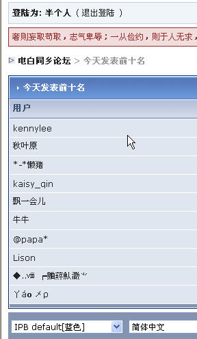 半个人 荣誉坛主 荣誉会员 注册 2004-08-16 消息 7,441 反馈评分 65 点数 71 2005-05-25 #1 今日发贴十名,女性占了6个。 论坛慢慢给女性称霸了 [attachmentid=22853] 附件 33.JPG 29.9 KB · 查看: 225