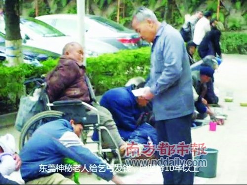 黎老伯说,目测这位东莞“老板”有七十多岁,说东莞本地话,大家只知道他姓黎。行乞者王老太说,每个月他两次来派钱,每次都要派出一两千元,一个月加起来少说也要3000,坚持了十年,“不是老板,哪有这么多的钱来派啊”。行乞者故又称他为东莞“老板”。