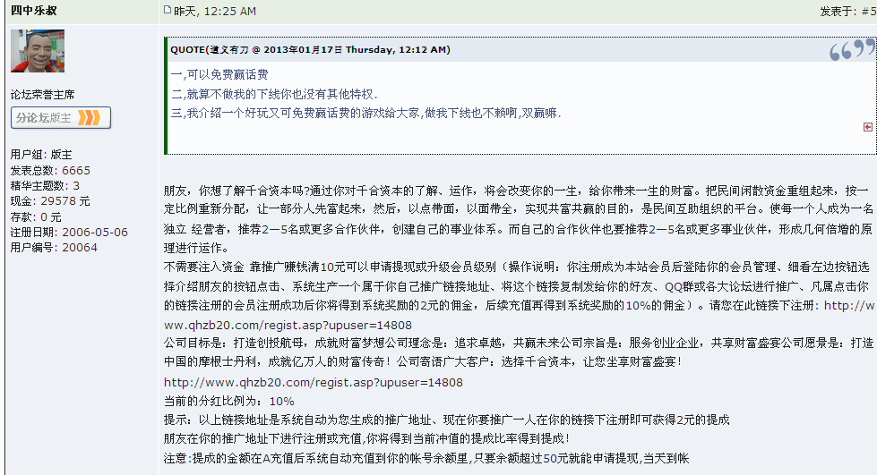 因为四中乐叔在我帖里面放连接结果我被人误会搞传销,没有最冤只有更冤。