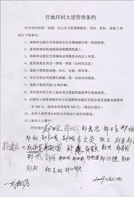 2009年,郑伟富签下的《官地村大道管理条约》。