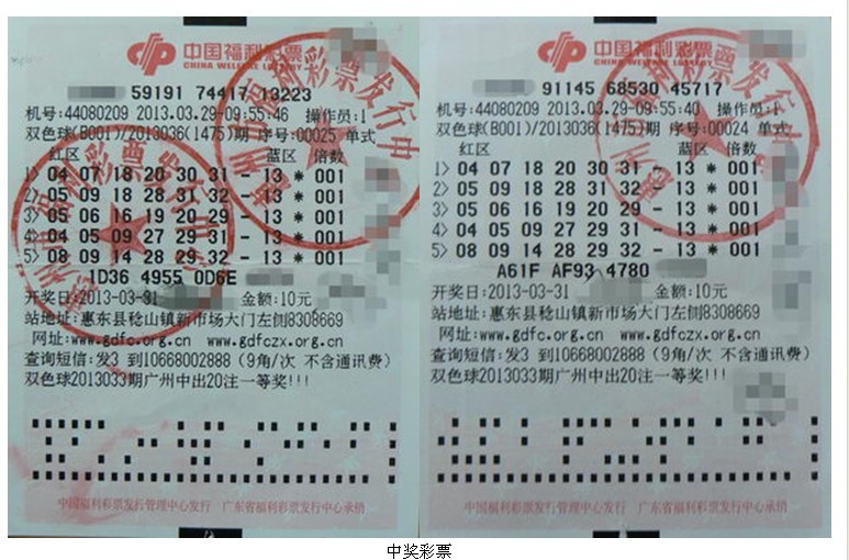惠州市的中奖彩票是出自同一站点的2张10元5注的自选单式票