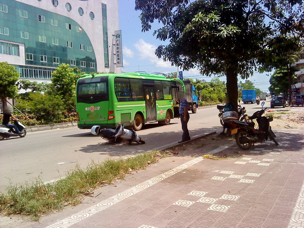 又是事发三角墟原长途客运站对面路口,看现场貌似图中公交与摩托接触,可能是瓦刚干活归途时间不撞巧,没见伤者,而公交车也没见乘客,真是要小心驾驶,特那些路段.