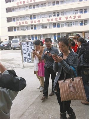 3月25日下午,永嘉二中老师在校门口贴标语讨薪 图片来源于温州703论坛