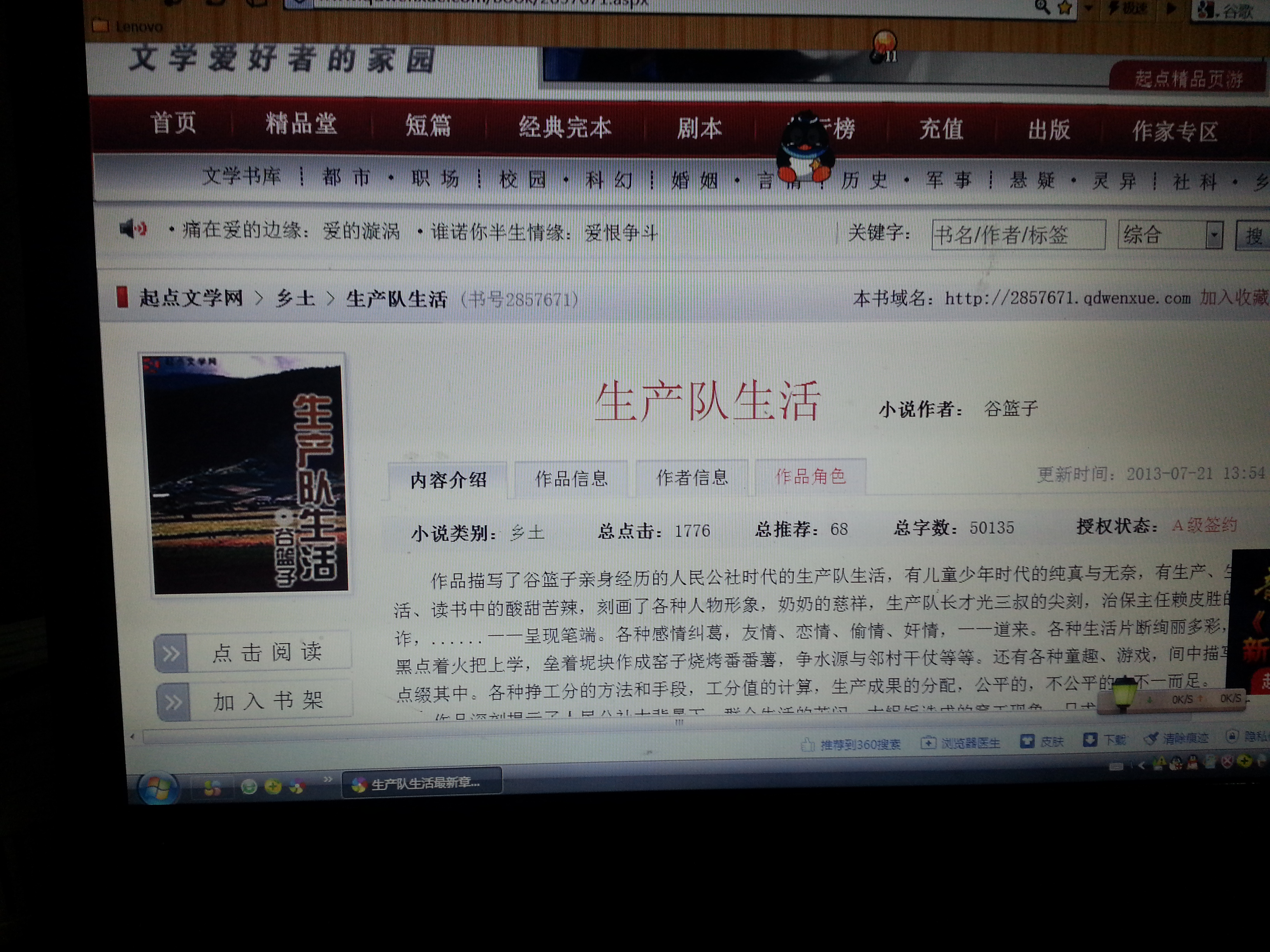 打开起点文学网,点击乡土板块,在显要位置就看得到彩色封面的《生产队生活》。