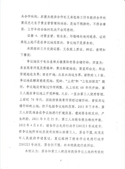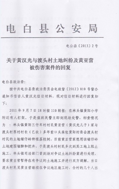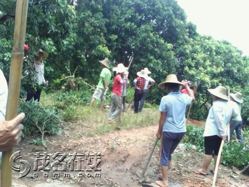 从2011年9月份开始至今,三年来,每年都被林头镇渡头村的恶霸借土地纠纷之名,多次组织几十人走上门来打砸、砍树、毁坏生产、打人,我家前后已有4人被多次打伤。如果真的是霸占他们土地,可以通过司法途径解决。但是事实上经县政府、市政府、市中院(判决书为:2012茂中法行初字第31号)都深入到现场调查取证,做出一致确权决定,已非常清楚确认为我家合法土地。可他们目无国法,在毫无法律、事实依据情况下,与某些人蓄意谋划,采用极端、野蛮手段来闹事。仗着人多对我家硬抢,经常几十人围攻我家闹事、砍树,毁坏财物、农作物,我家去制止就打人,无法无天。每次他们一来,我们都报警,可公安人员来了,也奈何不了他们。有一次,我儿子去制止,受到他们围攻殴打,晕倒在血泊中,最后住了一个多星期医院。经法医鉴定为轻伤,现在还不能干重活,有时还头晕头痛。更令人费解的是,电白县林头镇派出所竟然跟不法分子作验伤证明,把我儿子定为犯罪嫌疑人,拘留并罚款处理。