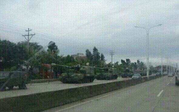 配发的照片是2012年5月份,解放军41军坦克部队在水东虎头山完成海训任务后开拔回营,往茂名方向行驶在高水公路上,具体时间是当天下午三点左右,气象条件是路过水东三角圩时阴阴沉沉,接近茂湛高速出口下起大雨,照片背景是乙烯厂到清河这段路。稍微有点常识的人都知道,中国现在的武警部队,甚至特警都还没有坦克、自行火炮一类重装备,