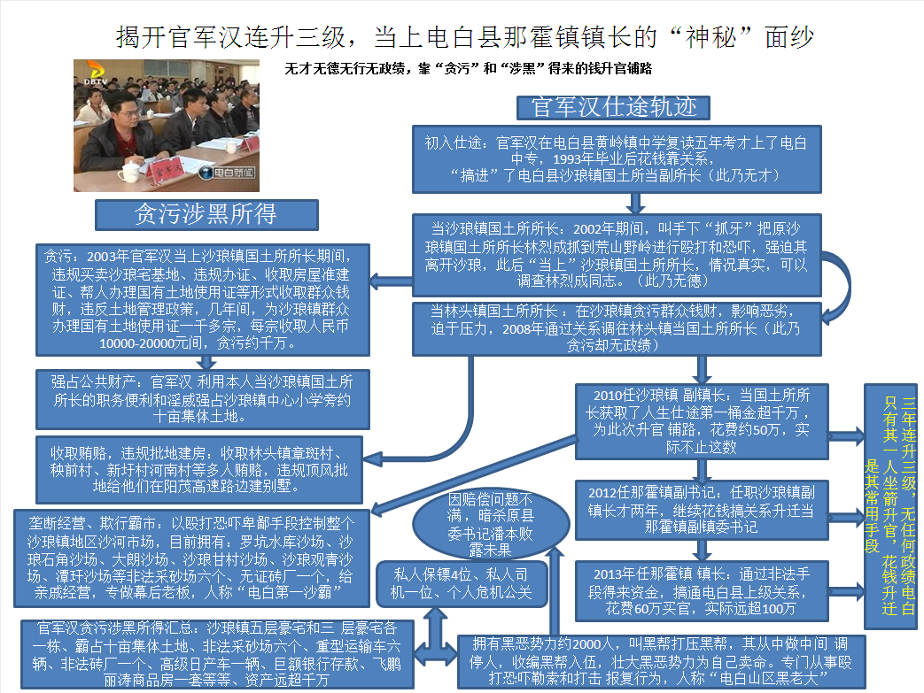 4、 由于在沙琅镇收受了太多群众的钱财以及其妹夫的事情影响,官军汉在沙琅镇也不受群众欢迎了,随后官军汉花钱买通组织关系为其调动到林头镇国土所任所长,在这期间又以强行拆除违章建筑的名义恐吓和勒索村民钱财,手段十分卑鄙。更为夸张的是收受林头村委会章斑村、秧前村、新圩村、河南村等村委多人巨额贿赂,违规顶风批地给他们在阳茂高速路边违规盖别墅!当时闹得整个电白满城风雨,电白县电视新闻多次曝光报道此违法行为,但奇怪的是他不单止没有受到处分,反而又被提拔为沙琅镇副镇长,原因就是他又花钱买通了当时去调查的官员,结果不了了之!可见其为官之狡猾!