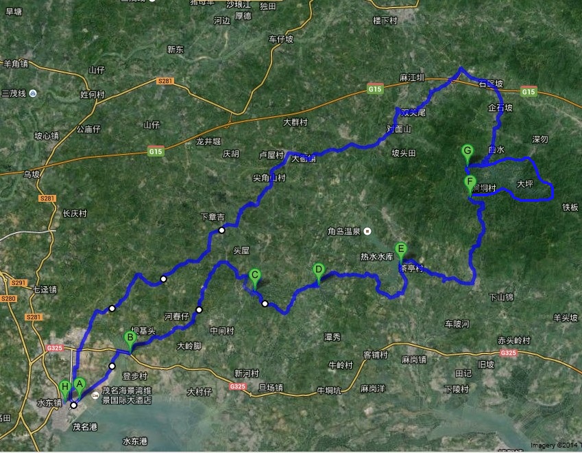 行程首先从水东经蓝田坡大道(地图B点)到河湾水库(地图C点),再骑秀田水库(地图D点),接着骑热水水库(地图E点),然后到达旱平水库(地图F点),返程探路出观珠高速路口沿乡道经大衙回水东,全程约90~110公里。此行部分线路为探索线路,路况未明,请有心骑友做足线路攻略。当天活动暂不安排吃中餐,请参加活动的骑友备足饮用水与干粮(建议带压缩饼干或水东粽子),晚饭将视情况在大衙就餐或自行解决,如发生就餐的费用当场AA,一般约15~30元/人。