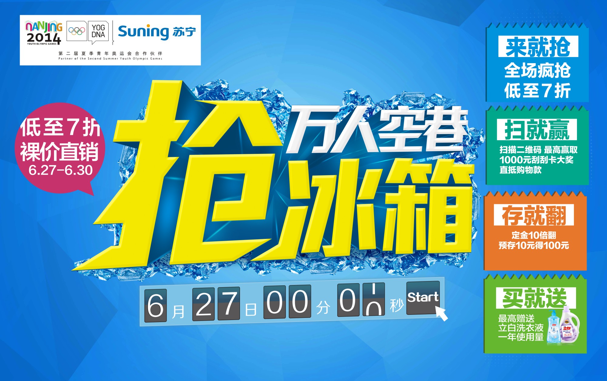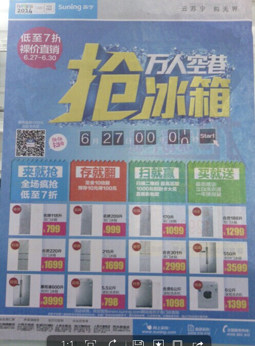 6月27日-6月30日万人空巷抢冰箱,低至7折裸价直销,水东镇人民路7号苏宁兴发购物广场二/三楼。HP笔记本I5-4200处理器 英伟达 820M 2G独显卡,惊爆价:3399元,HP笔记本I5处理器 1G独显卡,惊爆价:2999元。宏基笔记本I3处理器,1G独立显卡,惊爆价:2100元。