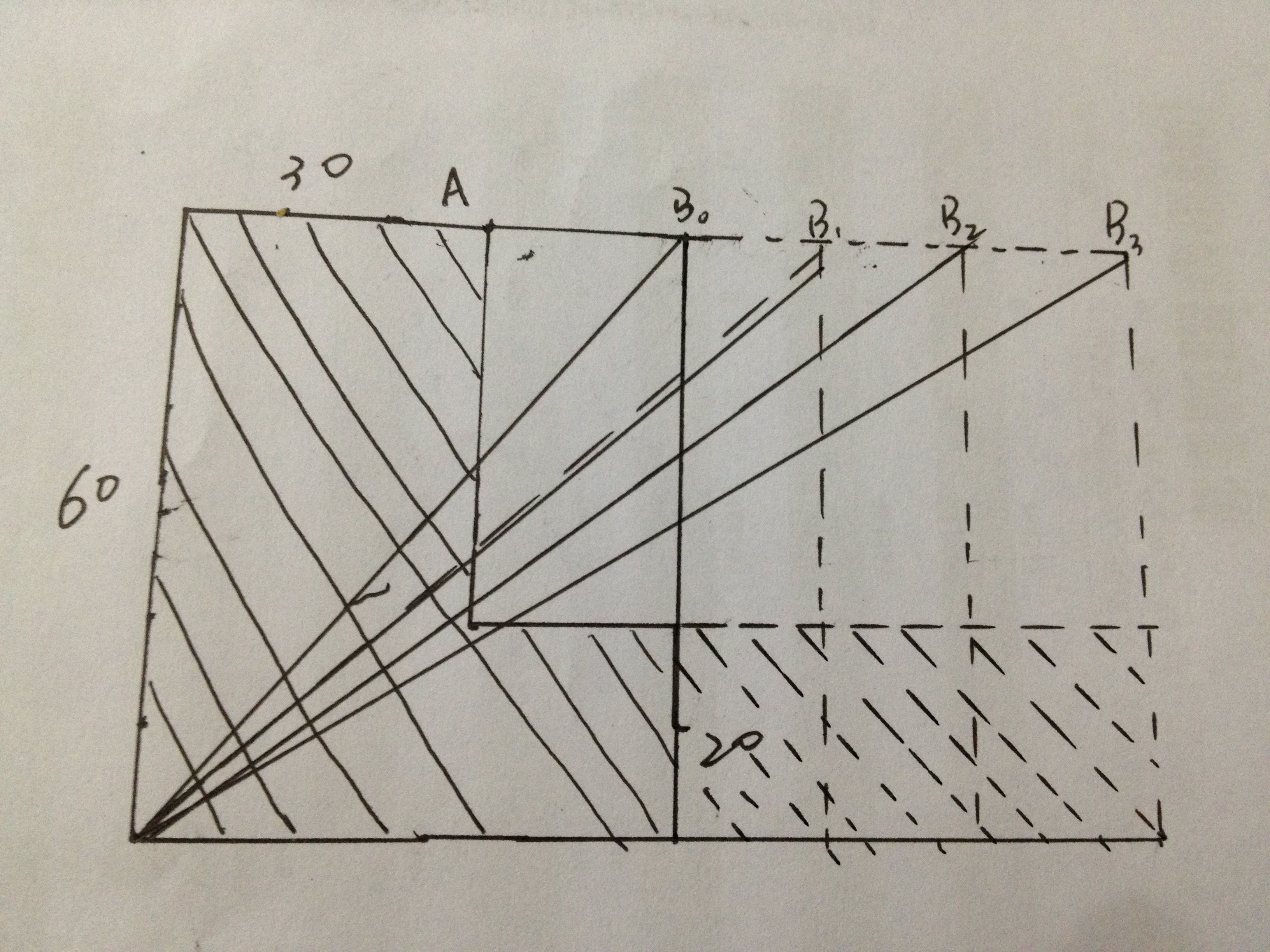 楼主还在钻牛角尖,那我再按题意的三个条件严格按比例作个图让你看看吧。因为AB没有给出具体数据限制,因此它可以是B0,B1,B2,B3。因此,阴影面积也会跟着变,三点同线只是千万中的偶然唯一。