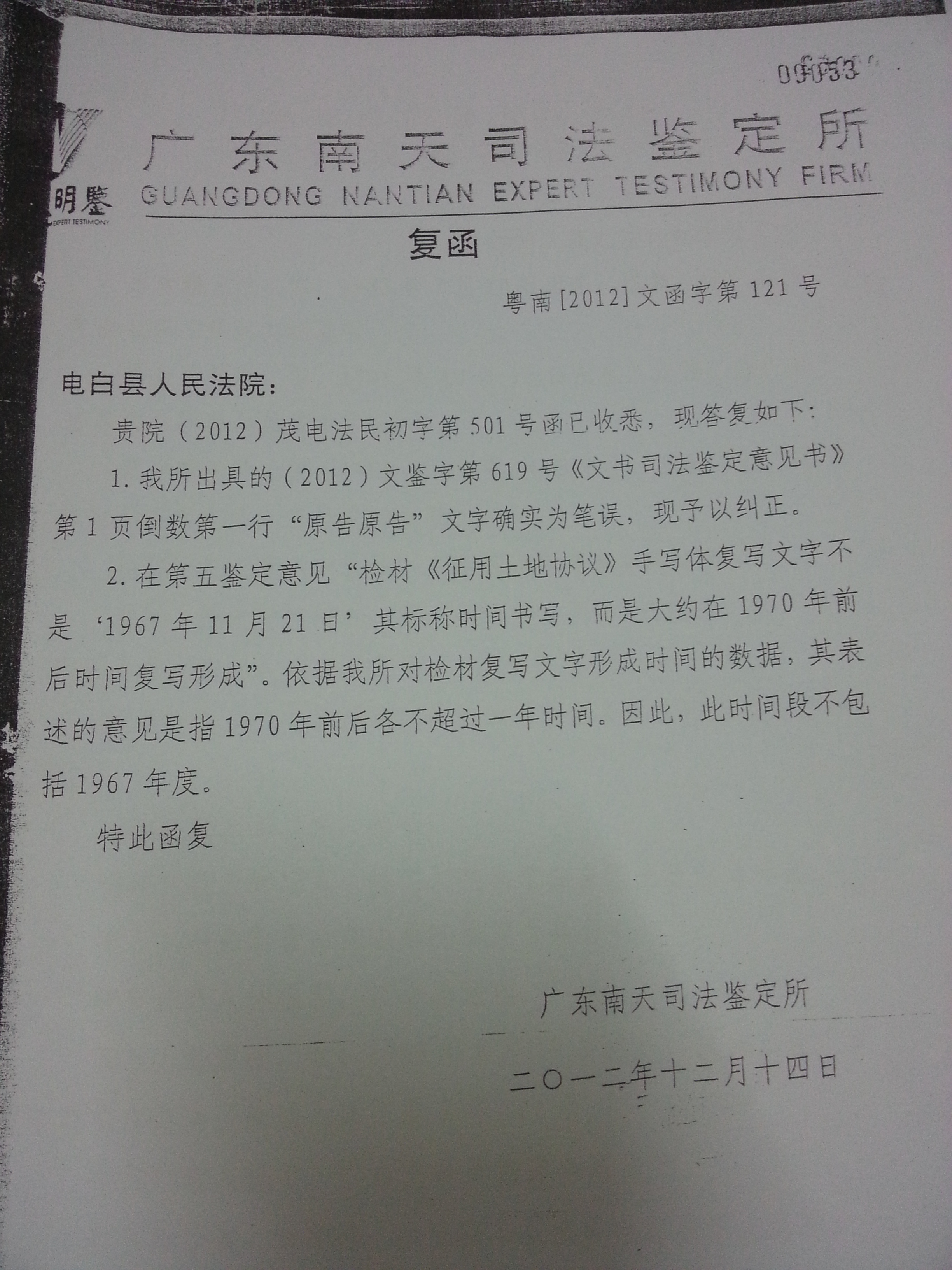 《广东南天司法鉴定所复函》