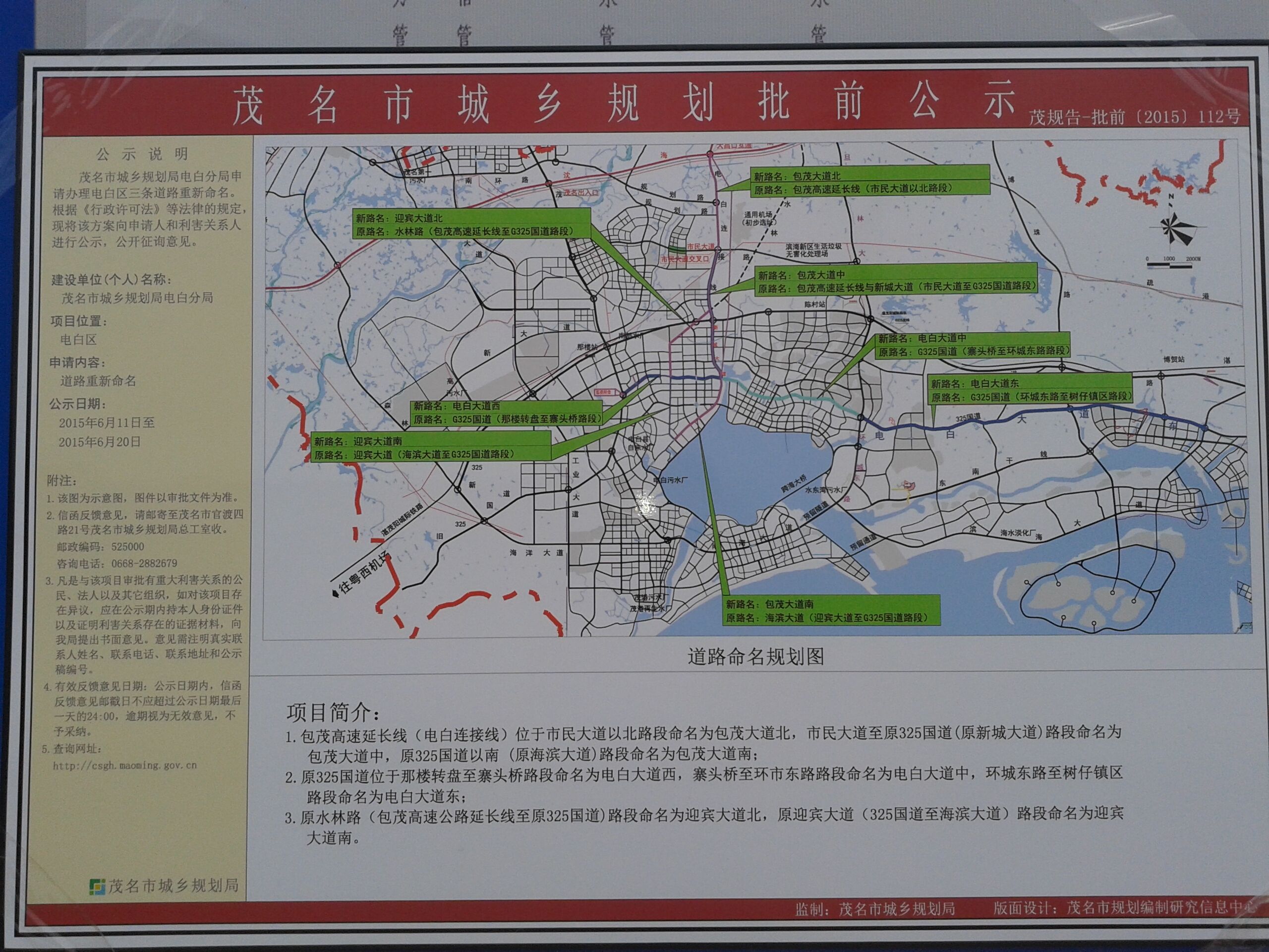 不要忘记电白是靠海的,应与“海”字为主来名命街道才有特色。另外325国道去哪了?是不是要改道?
