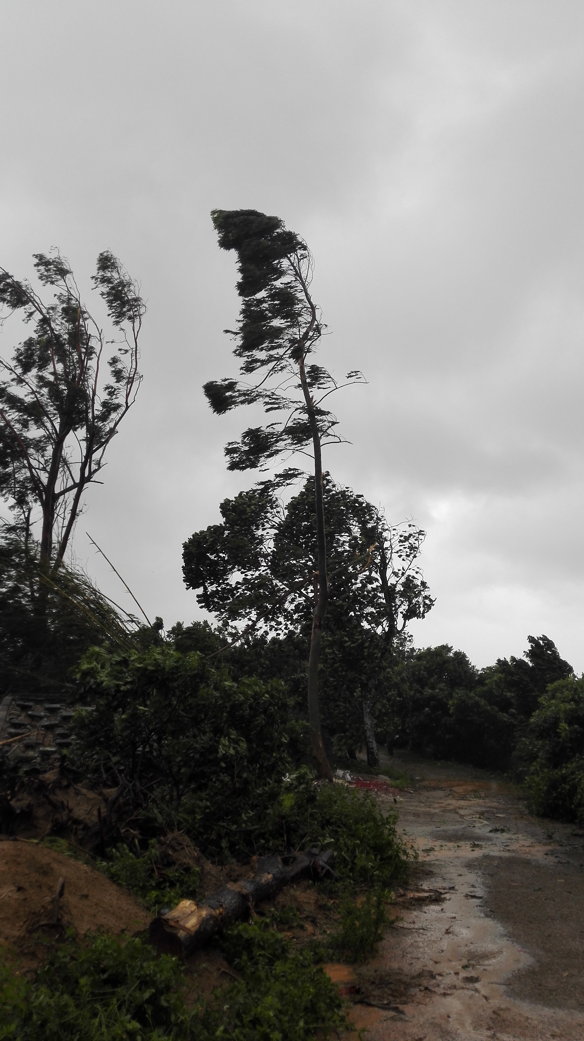 在台风中,吹断了很多树枝还有瓦片.