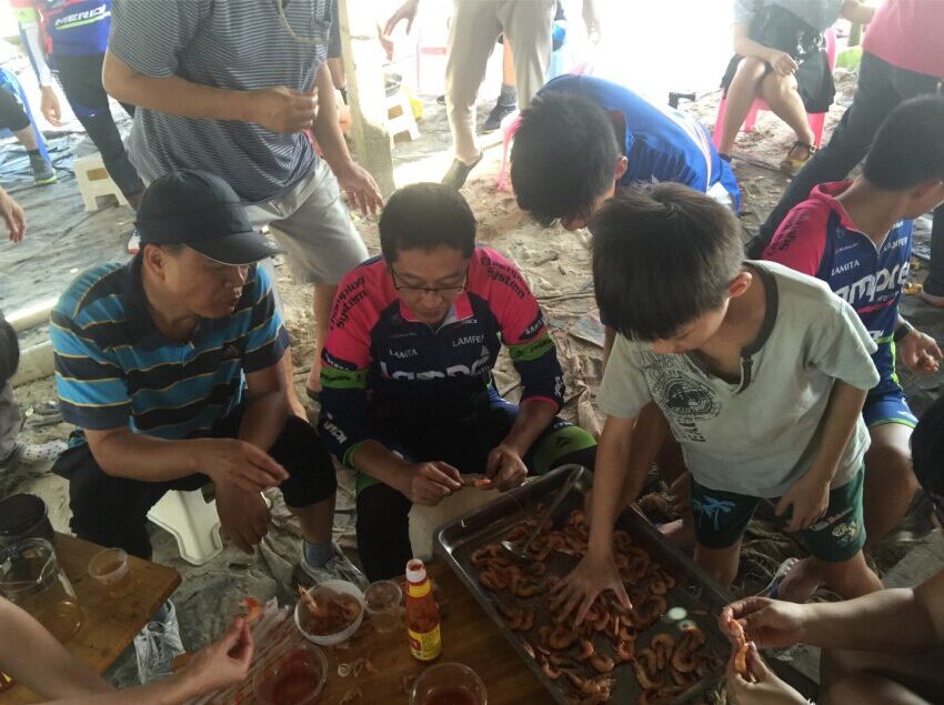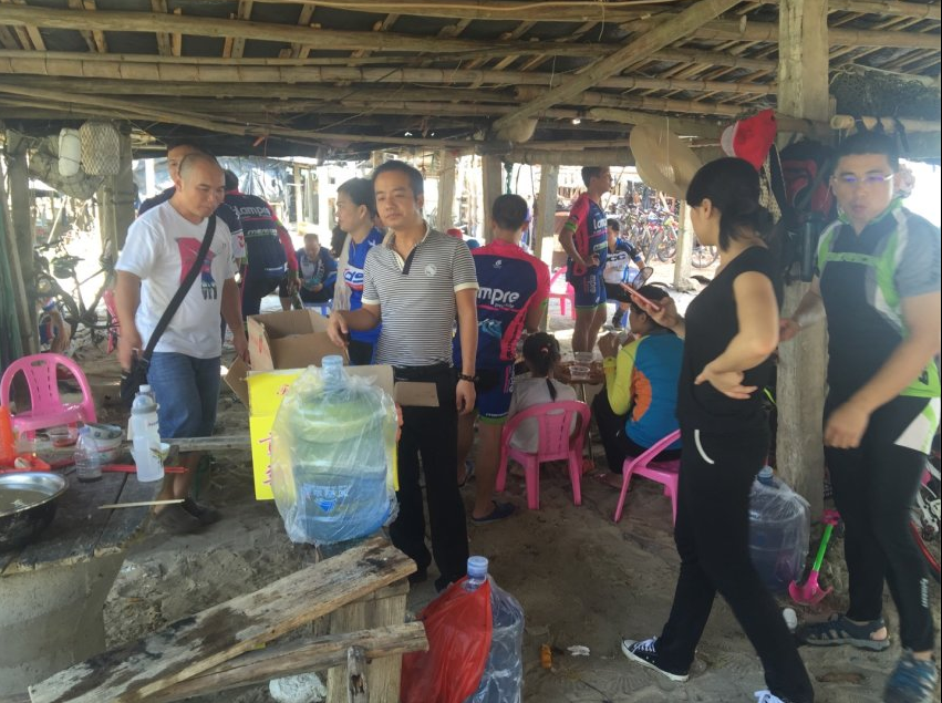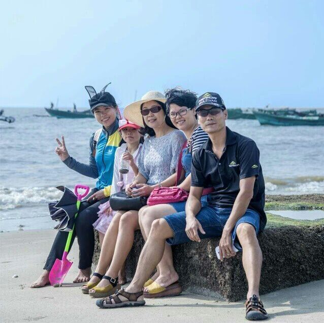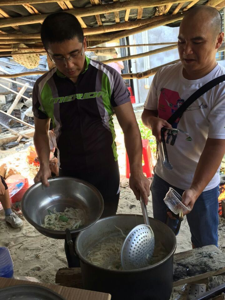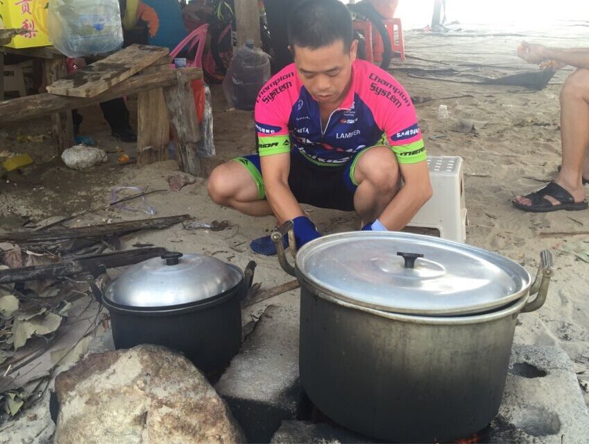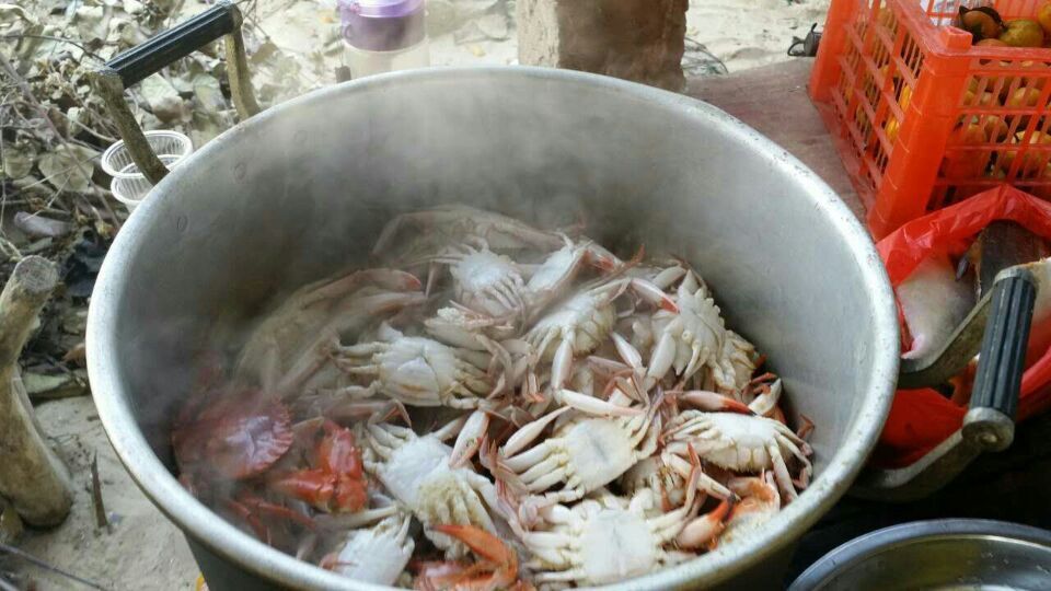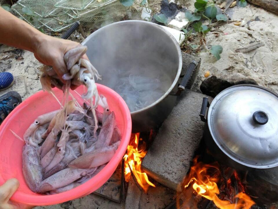 不觉间,我们就到了目的地龙山杨梅村委会上杨梅村,这个古老而安静的小渔村,少被游人打扰,多年来渔民都过着潮小而作,潮大而息的简朴生活,海滩沙质洁白细软,环境天然无污染,每户都有一个由水泥柱、竹架、沥青纸搭建的工棚。大家齐动手围起炉灶,架起两个锅。