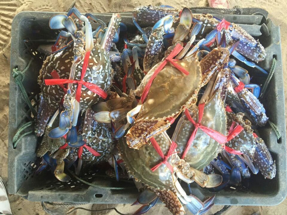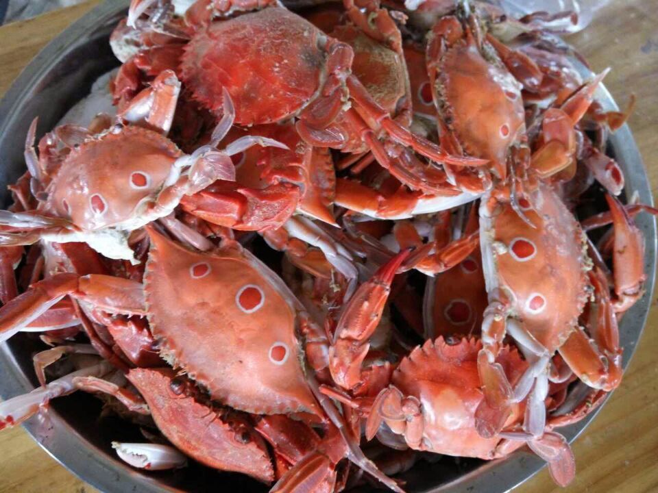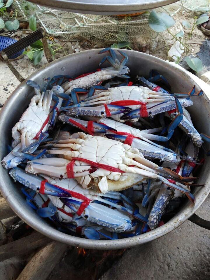 首先送上的是十多斤的清蒸三眼花蟹,不到五分钟就无影无踪,接着白灼6斤多小白虾,一眨眼又被消灭,再白灼5斤多小海杂鱼也无济于事,见到这阵势,厨师们赶紧呼叫21斤大花蟹增援,烧开水冲茶水淹七军以缓解一下气氛。