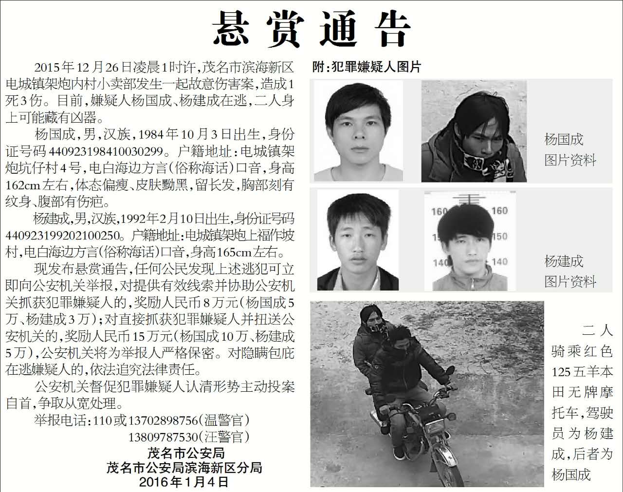 2015年12月26日凌晨1时许,茂名滨海新区电城镇架炮内村发生一起故意伤害案,致1死3伤。经过市、区两级公安机关8天的艰苦鏖战,已抓获犯罪嫌疑人12名。目前,仍有犯罪嫌疑人杨国成、杨建成在逃,警方决定向社会悬赏缉凶。