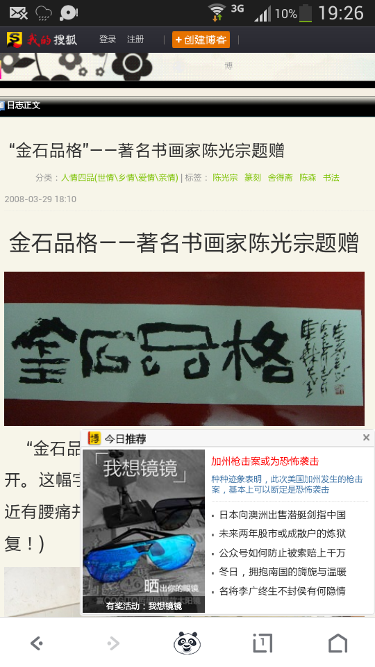 QUOTE(浮生江海客 @ 2016年03月09日 Wednesday, 08:20 PM) 其实老陈字笔画死板,弄拙成拙,不识变通,就是丑字的电脑体而已。把字写丑就叫创新,这也是一条断头路。 [snapback]3792460[/snapback] [attachmentid=348908] 只有山人等人授予陈光宗老师为“世界级书法大师”的衔头。说陈光宗是著名书法 家,这是没什么问题的。