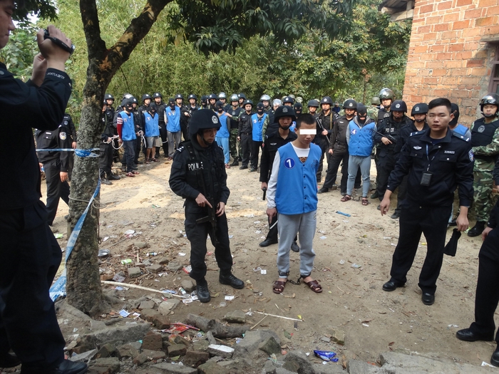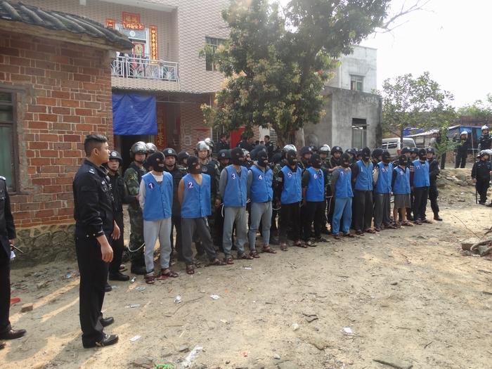 3月29日,茂名市公安局滨海新区分局组织150多名警力,武装押解2015年“12.26”故意伤害致死案11名犯罪嫌疑人,到茂名滨海新区电城镇架炮村和电白区岭门镇十四坡等4个地点指认现场。