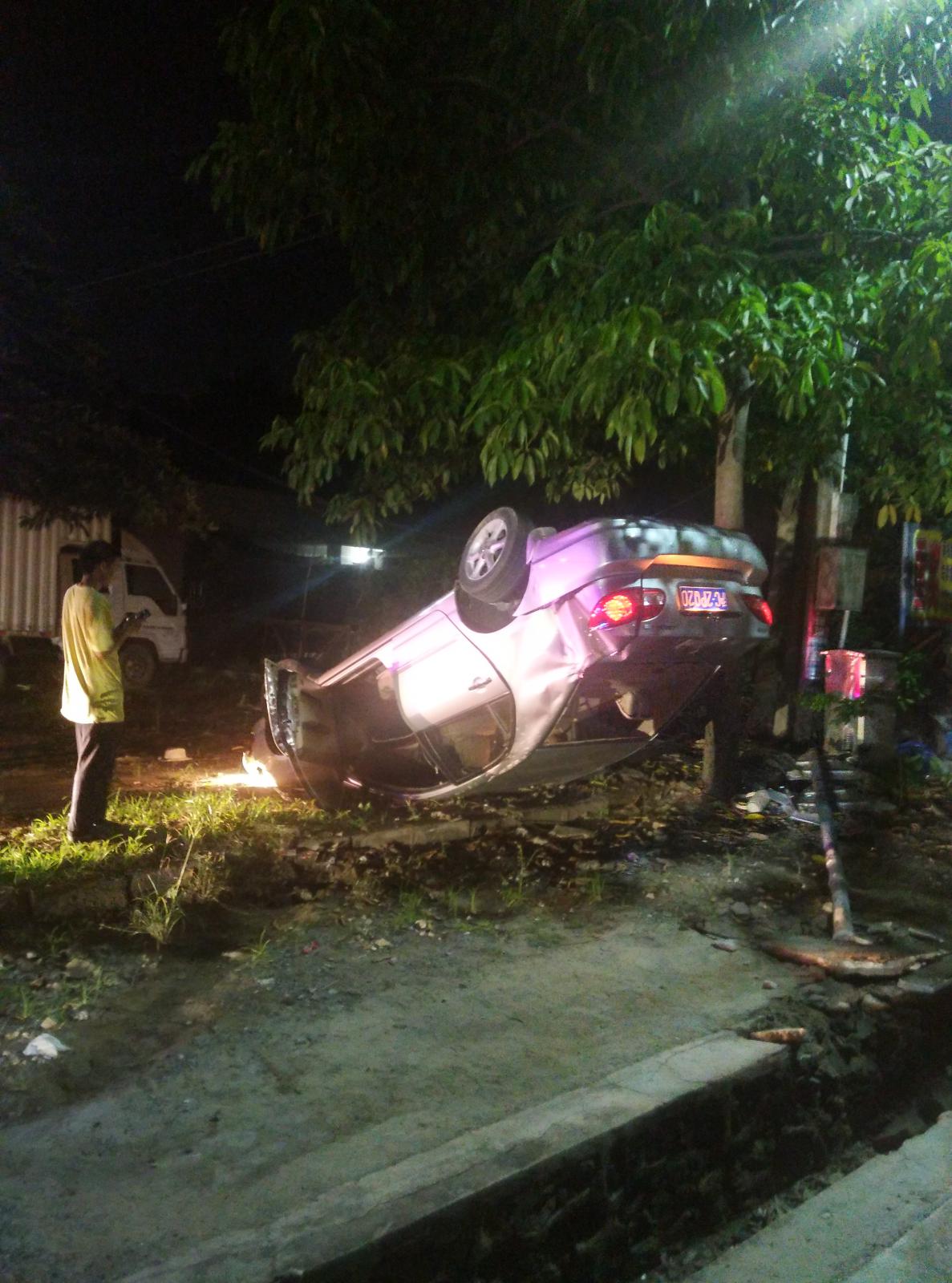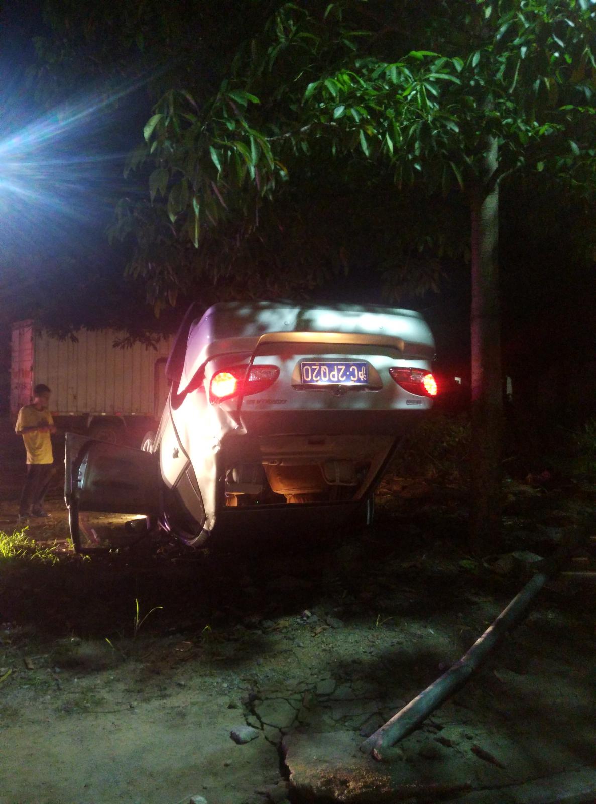 昨晚11:30分,我在龙山卫生院旁的大排档喝酒,喝得正高兴时,背后的路边传来刺耳的刹车声,几秒后不远处传来撞击声。朝卫生院方向看过去,一台小轿车冲过马路的对面,四轮朝天。我和几个伙计说:“走,救人。”我们赶紧跑过去,还没到小车旁,两男两女已经从车内爬了出来,我问其中一个女的有没有事?她张开手,我发现手掌的虎口处流了一点血,其他地方没发现有伤痕,其他人都说没大碍。这时四周跑来看热闹的人多了起来,有人骂司机:你妈的,不是醉驾就是毒驾,幸好没撞到路人,撞了人就坐穿牢底。