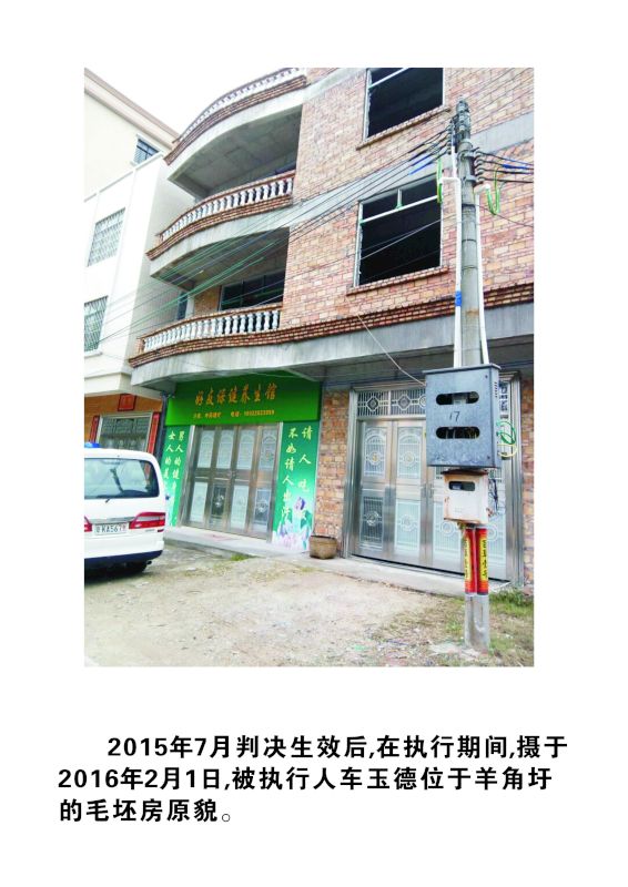 该判决已于2015年7月25日生效,生效后我父亲委托律师提交了强制执行申请书。判决生效至今已一年多了,期间被执行人车玉德当时有一橦三层新建的、位于羊角镇政府门口附近的私宅,住宅建筑面积达七百多平方,当时还是毛坯房,里外并未装修。在执行期间,我和父亲不下十余次催促电白区法院执行局执行庭廖颖刚庭长前去查封拍卖,可是他却多次拖延,没有采取任何制止措施,也不拘留被执行人车玉德以维护法律正义,并对被执行人花重金装修新宅采取放任自由态度。今年六月份,该被执行的房子,被车玉德花重金装修好了,车玉德存放在家里的现金顺利地转移到他的不动产房子上。