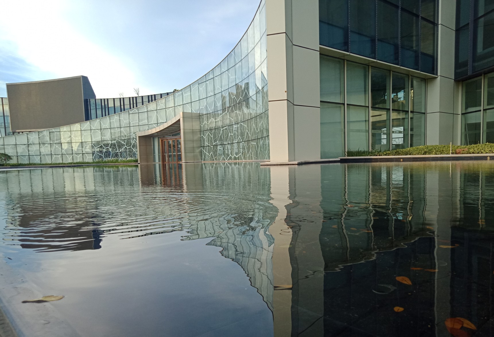 图为广东热带国家农业公园绿湖,远处是歌舞台的白色棚顶,像两顶斗笠。绿湖沿岸只有三座远离绿湖的1---3层的房屋,突出了水景和森林景色